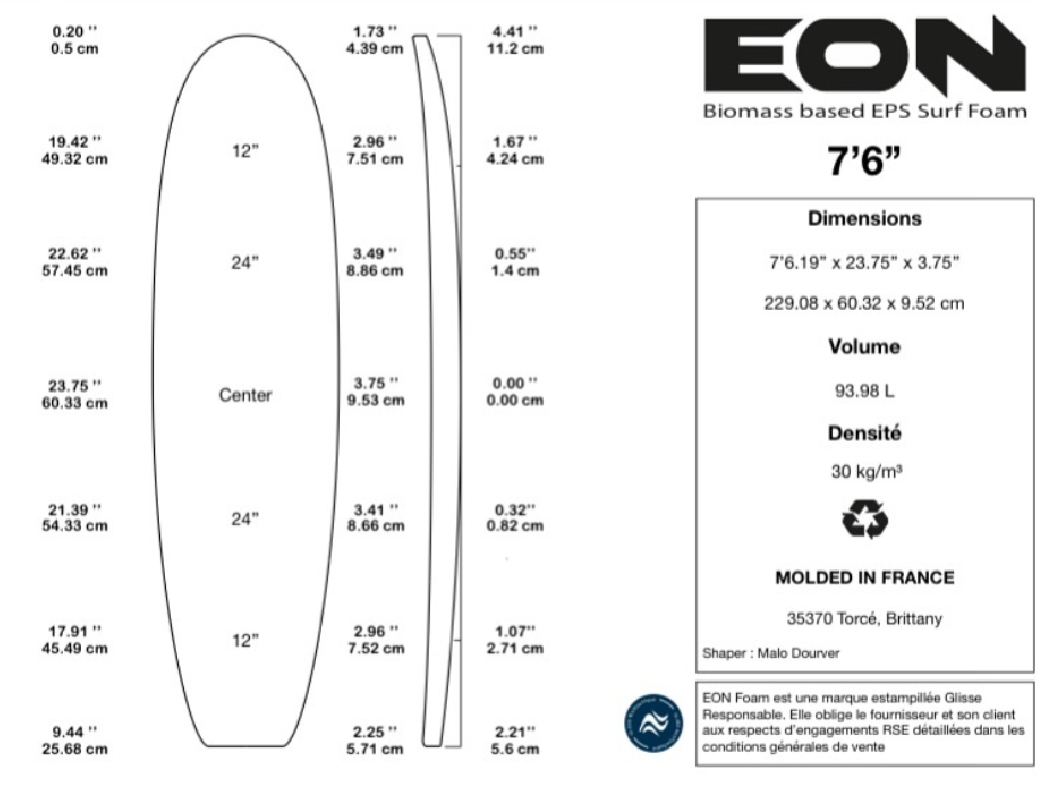 Pain de mousse EON Foam 7'6"MALIBU moulés en France (Bretagne) non latté.
