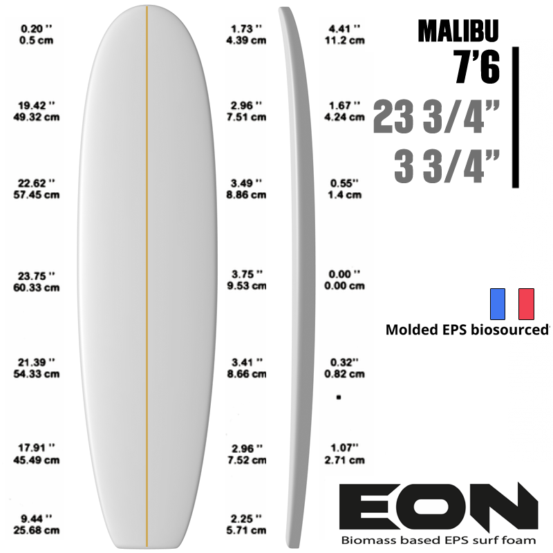 Pain de mousse EON Foam 7'6"MALIBU moulés en France (Bretagne), lattage 3mm Plywood
